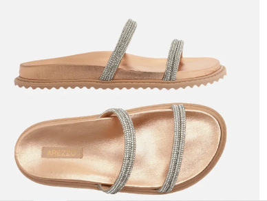 Papete Arezzo Rasteira Nude Tratorada Strass. O modelo tem palmilha com formato anatômico e inscrição do nome da marca. Possui base emborrachada tratorada e bico redondo. Traz tiras com strass sobre os dedos e o peito do pé. A sandália é aberta e exibe todo o pé.