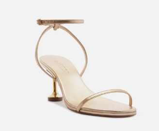 Sandália feminina dourada. O sapato tem salto médio taça metálico dourado e formato arredondado na ponta. Possui tira fina sobre os dedos, além de tiras finas que saem das laterais, cruzam no calcanhar, contornam o tornozelo e fecham em fivela lateral ajustável.